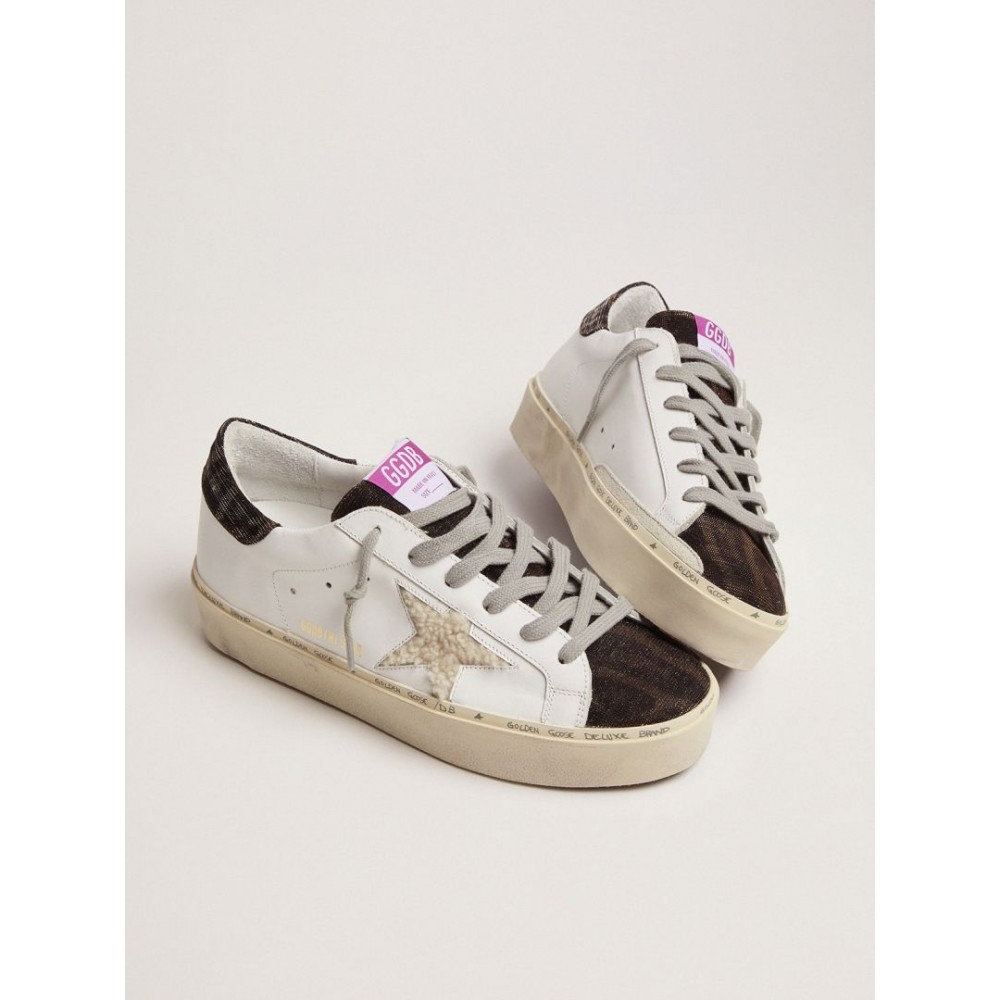 A model that borrows the design of the Superstars, adapting it in contemporary style. Hi-Stars elevate their style thanks to the platform sole and handwritten lettering around the foxing: a detail that captures our tradition of craftsmanship. This style has a white leather upper, shearling star and leopard-print tongue.