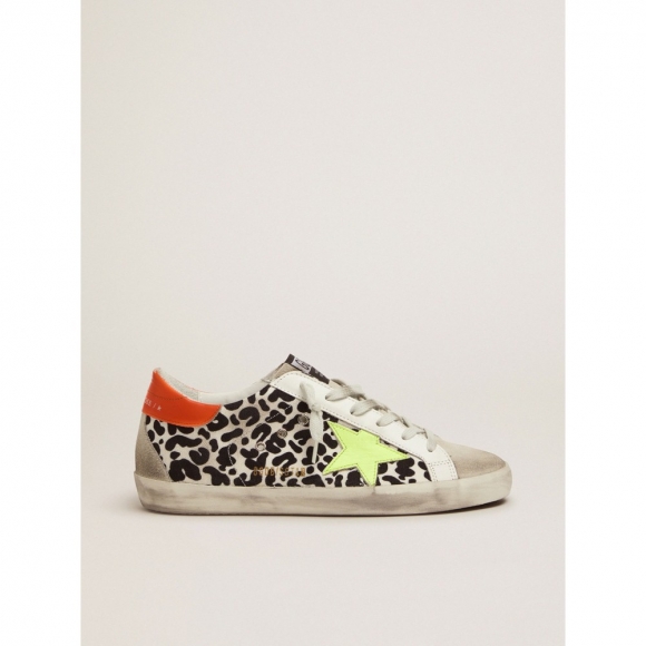 Animal prints and references to nature are some of our hallmark distinctive features. These Super-Stars enhance the classic design with a leopard-print upper and contrasting neon yellow star and orange heel tab.