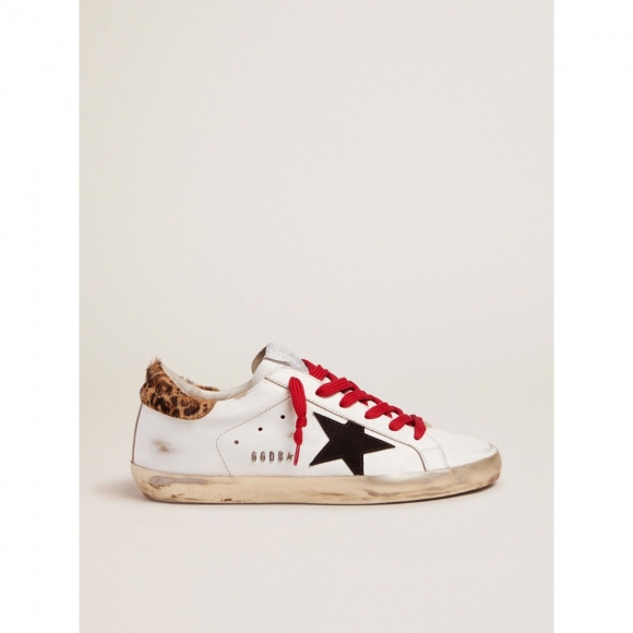 With our sneakers we love to play around with contrasts, creating unique combinations and rewriting the classic rules. On these Super-Star sneakers we have added animal-print detail to the heel tab, combining it with a black star and red laces.